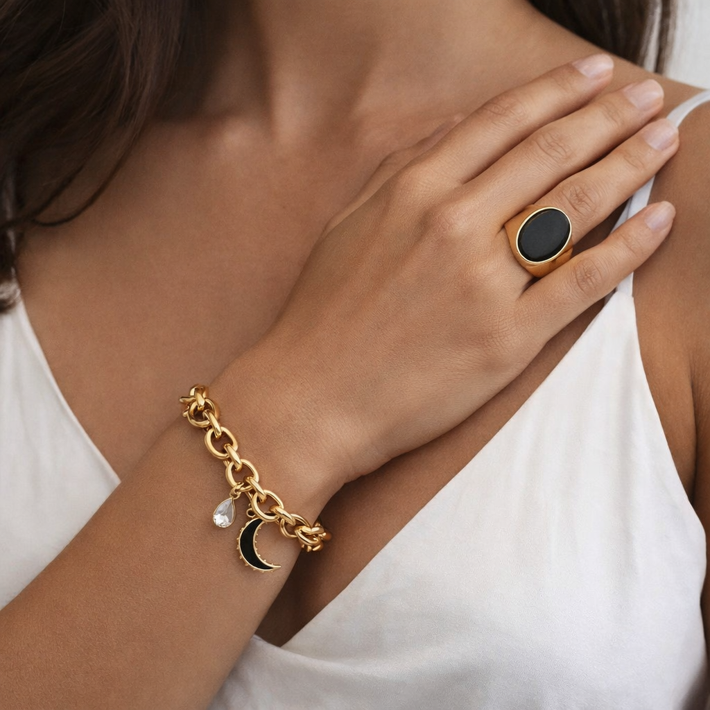 Luxe 18K Gold Plated Black Crescent Moon Chain Bracelet & Ring Piece Set